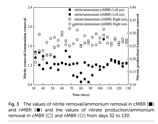 2. 生物量保留數(shù)據(jù):測(cè)量了混合液懸浮固體(MLSS)和出水懸浮固體(SS)。研究意義是證明nMBR通過無紡布膜促進(jìn)生物膜形成,減少生物量流失,提高生物質(zhì)保留,這對(duì)于慢速生長(zhǎng)的anammox細(xì)菌富集至關(guān)重要。