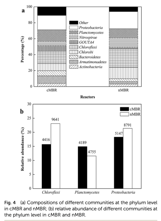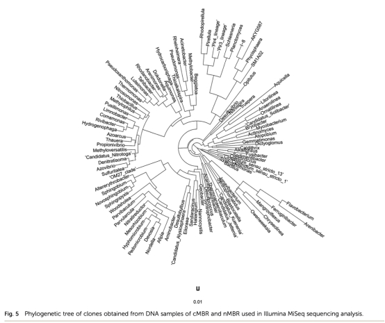 3. 微生物群落數(shù)據(jù)(來自圖4、圖5和FISH/qPCR結(jié)果):通過Illumina MiSeq測(cè)序分析了細(xì)菌群落組成(如Planctomycetes、Proteobacteria等),F(xiàn)ISH半定量分析anammox細(xì)菌比例,qPCR定量anammox細(xì)菌拷貝數(shù)(如nMBR在120天達(dá)1.07×10^9 copies/mL)。研究意義是揭示nMBR富集更多anammox細(xì)菌,解釋其性能優(yōu)勢(shì),并為微生物生態(tài)研究提供數(shù)據(jù)。