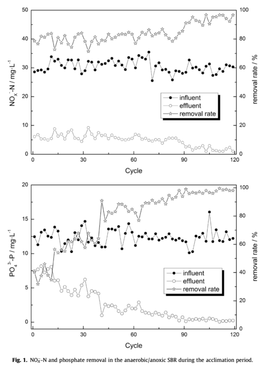1 氮氧化物和磷去除數據,來自圖1。研究意義是驗證反應器在馴化期間的性能穩定性,顯示NO-N和磷去除率均高于93.74%和97.49%,表明DPAOs成功富集,為后續實驗提供基礎。