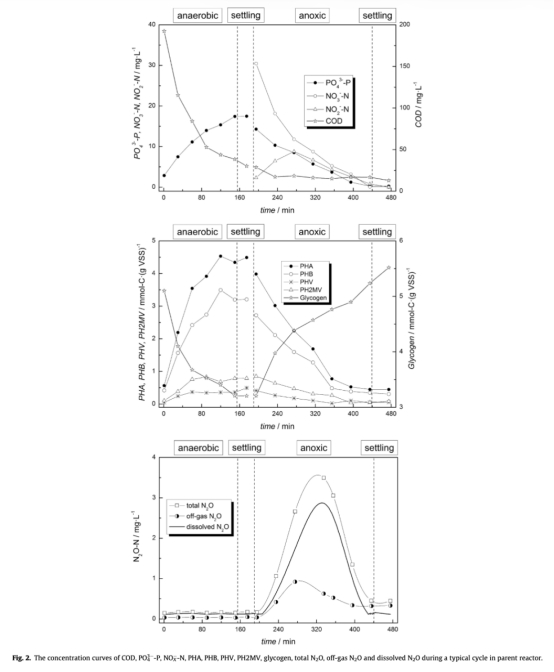 2 典型循環中各參數濃度曲線數據,包括COD、PO3--P、NOX-N、PHA、糖原和N2O,來自圖2。研究意義是展示DPAOs的典型代謝表型,如厭氧期COD消耗伴隨PHA合成和磷釋放,缺氧期同步反硝化和磷吸收,并揭示N2O主要產生于缺氧期,峰值達3.56 mg/L,關聯到PHA降解導致的電子競爭。