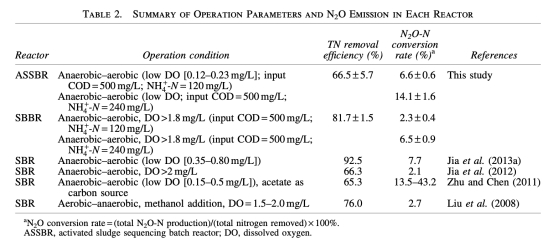 4 N2O轉換率數據,即N2O產量占去除總氮的百分比,來自表2。研究意義是量化排放強度,顯示ASSBR的N2O轉換率更高,尤其在高銨負荷下,強調操作參數對減排的重要性。