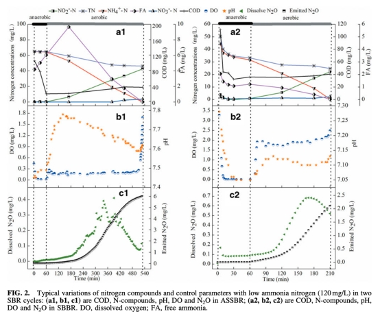 2 N2O排放濃度和時間曲線數據,來自圖2c1、c2和圖3c1、c2。研究意義是量化亞硝化過程中的溫室氣體排放,揭示N2O產生與亞硝酸鹽積累正相關,幫助識別排放熱點和控制策略。