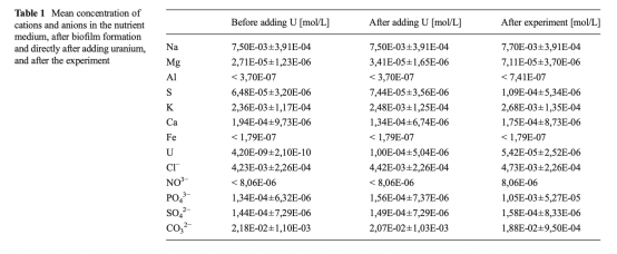 1 化學(xué)分析數(shù)據(jù),包括營(yíng)養(yǎng)介質(zhì)中鈾、磷酸鹽等離子濃度變化,數(shù)據(jù)來自Table 1。研究意義在于量化鈾去除效率(約50%固定于生物膜)和磷酸鹽釋放(從12.7 mg/L增至99.8 mg/L),揭示生物礦化過程中磷酸鹽的關(guān)鍵作用,為理解鈾固定機(jī)制提供定量基礎(chǔ)。