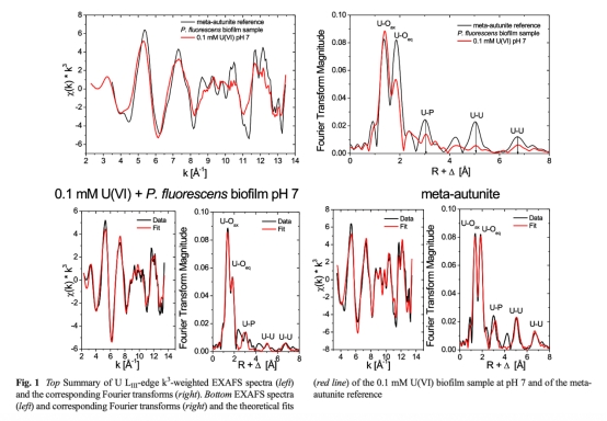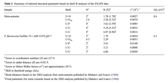 2 EXAFS光譜數(shù)據(jù),顯示鈾在生物膜中的局部結(jié)構(gòu),數(shù)據(jù)來自圖1和Table 2。研究意義在于首次證實(shí)生物膜中形成類似meta-autunite的鈾酰磷酸鹽礦物,表明生物礦化而非簡(jiǎn)單吸附,有助于評(píng)估鈾的長(zhǎng)期穩(wěn)定性。