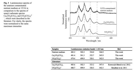 3 TRLFS光譜數(shù)據(jù),鑒定液相中鈾物種,數(shù)據(jù)來自圖3。研究意義在于識(shí)別出Ca2UO2(CO3)3和UO2(CO3)3^4-等遷移性物種,提示在無生物膜條件下鈾可能通過碳酸鹽絡(luò)合物遷移,為風(fēng)險(xiǎn)評(píng)估提供依據(jù)。
