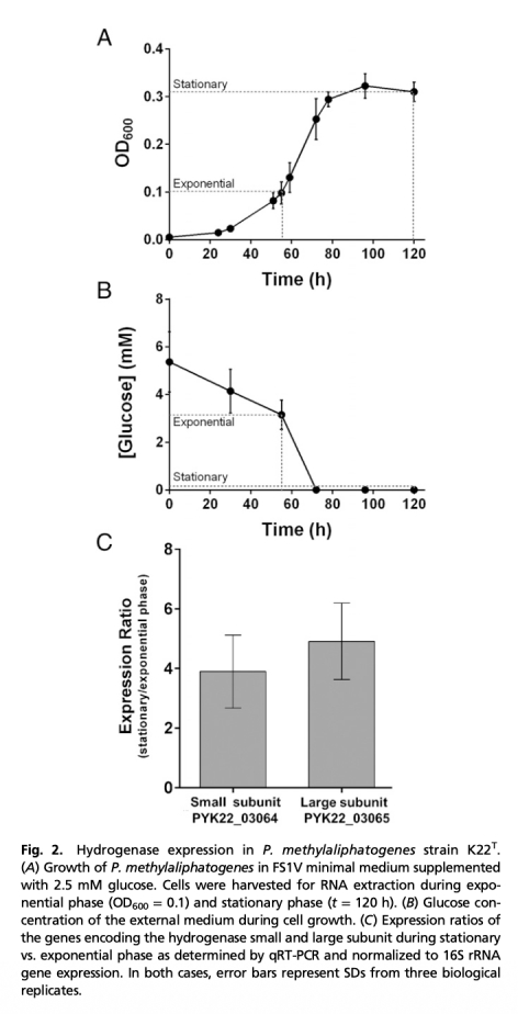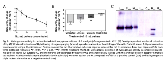 1 氫化酶基因表達(dá)數(shù)據(jù),顯示穩(wěn)定期小亞基和大亞基基因表達(dá)上調(diào)4-5倍,來(lái)自圖2C。研究意義在于證實(shí)碳限制觸發(fā)氫化酶上調(diào),關(guān)聯(lián)持久性狀態(tài)與痕量氣體利用,為理解微生物代謝轉(zhuǎn)換提供分子證據(jù)。