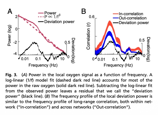 2. 局部氧功率譜數(shù)據(jù):局部氧功率譜在0.003-20 Hz范圍內(nèi)符合1/f關(guān)系(指數(shù)β=1.74),但偏離嚴格1/f擬合,偏差功率在0.01-0.4 Hz與相關(guān)信號頻率分布匹配。研究意義在于揭示局部氧波動由1/f組件和帶限組件疊加而成,帶限組件與長程相關(guān)相關(guān)。數(shù)據(jù)來自圖3A、3B。