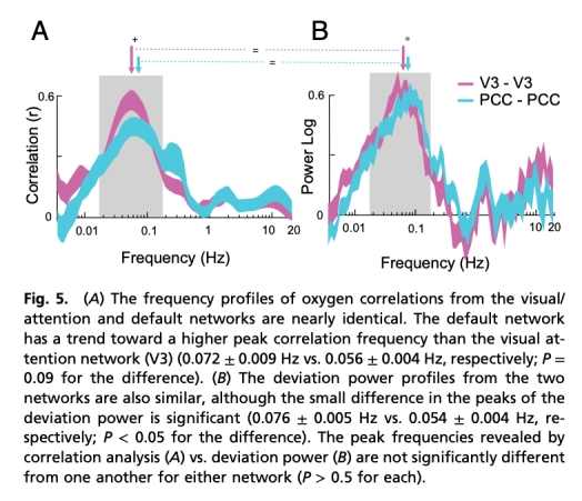 3. 網(wǎng)絡(luò)間差異數(shù)據(jù):默認網(wǎng)絡(luò)和視覺/注意網(wǎng)絡(luò)的氧相關(guān)峰值頻率有差異(默認網(wǎng)絡(luò)0.072 Hz,視覺網(wǎng)絡(luò)0.056 Hz)。研究意義在于提示不同網(wǎng)絡(luò)可能由特定振蕩機制驅(qū)動,支持機制特異性。數(shù)據(jù)來自圖5A、5B。
