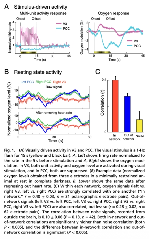 4. 控制實驗數(shù)據(jù):腦外組織記錄的相關(guān)性極低(r=0.10),顯著低于腦內(nèi)相關(guān)。研究意義在于排除電氣噪聲或運動偽影等非氧相關(guān)因素,確認觀測到的相關(guān)是神經(jīng)源性的。數(shù)據(jù)來自圖1C。