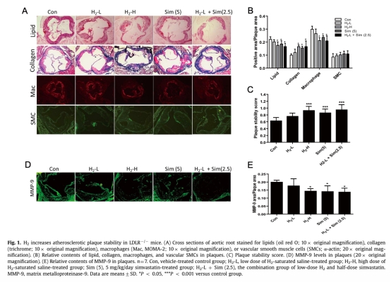 1. 氫氣處理能顯著增強低密度脂蛋白受體敲除小鼠的動脈粥樣硬化斑塊穩定性,表現為膠原增加、巨噬細胞和脂質減少,類似辛伐他汀效果。