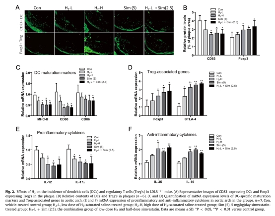 2. 免疫細胞數據:氫氣減少斑塊中樹突狀細胞數量,增加調節性T細胞數量,降低促炎細胞因子表達。研究意義表明氫氣通過調節免疫炎癥反應促進斑塊穩定。數據來自圖2A-F。