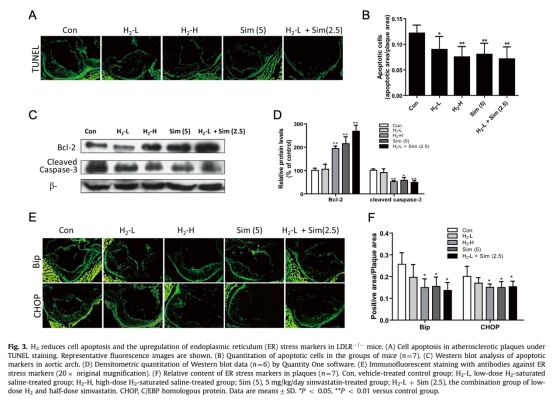 3. 細胞凋亡數據:氫氣降低斑塊TUNEL陽性細胞數,減少cleaved caspase-3表達,增加Bcl-2水平。研究意義在于證實氫氣抑制細胞凋亡,有助于斑塊穩定。數據來自圖3A-D。