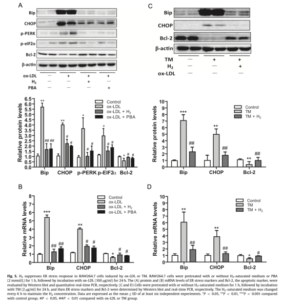 4. 內質網應激數據:氫氣抑制斑塊和細胞中Bip、CHOP表達及PERK、eIF2α磷酸化。研究意義在于揭示氫氣通過抑制內質網應激途徑減少凋亡。數據來自圖3E-F、圖5A-D。