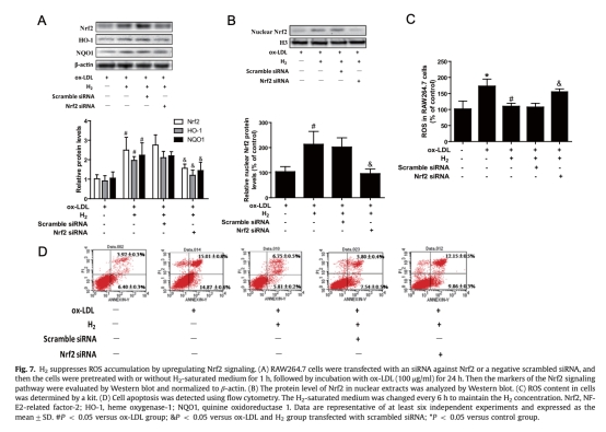6. Nrf2通路數據:氫氣增加巨噬細胞中Nrf2核轉位和靶基因HO-1、NQO1表達,Nrf2 siRNA取消氫氣對活性氧的抑制作用。研究意義在于闡明氫氣通過激活Nrf2抗氧化通路減輕氧化損傷。數據來自圖7A-D。