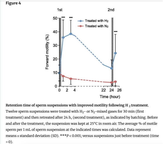1. H2處理能顯著提高損傷精子的前向運(yùn)動(dòng)率,效果在30分鐘內(nèi)顯現(xiàn),并可持續(xù)數(shù)小時(shí)。