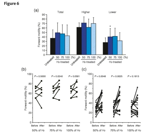 7. 冷凍解凍精子數(shù)據(jù):H2處理顯著改善低運(yùn)動(dòng)力(<50%)精子的前向運(yùn)動(dòng)率,尤其用50% H2培養(yǎng)基效果最佳。研究意義在于驗(yàn)證H2在輔助生殖技術(shù)中的實(shí)際應(yīng)用潛力。數(shù)據(jù)來(lái)自圖6。