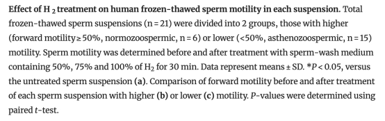 3. 精子存活率相關(guān)數(shù)據(jù):在高存活率(>20%)精液中,H2處理使前向運(yùn)動(dòng)率從3.0%提高至11.0%,而低存活率精液改善有限。研究意義表明H2對(duì)仍有活性的精子更有效,提示其作用依賴于細(xì)胞活力。數(shù)據(jù)來(lái)自圖2。