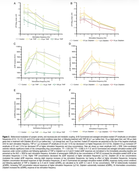 3 氧消耗變化(ΔCMRO2)數(shù)據(jù):THIP和Zolpidem在低濃度下增加ΔCMRO2于低頻刺激,高濃度下抑制于高頻刺激。研究意義表明GABA調(diào)節(jié)代謝與血管反應(yīng)耦合,反映神經(jīng)活動能量需求變化。數(shù)據(jù)來自Figure 2E和2F。