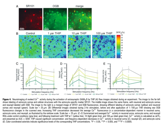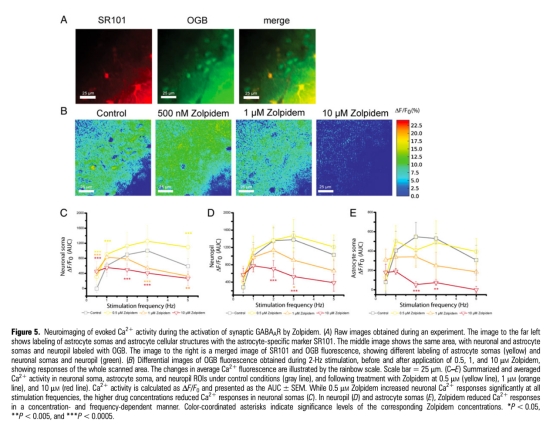 4 胞內(nèi)Ca2+瞬變數(shù)據(jù):THIP濃度依賴性地抑制神經(jīng)元胞體、神經(jīng)氈和星形膠質(zhì)細(xì)胞Ca2+響應(yīng);Zolpidem低濃度增加神經(jīng)元胞體Ca2+,高濃度抑制。研究意義提示Ca2+信號介導(dǎo)GABA能調(diào)節(jié)的神經(jīng)血管耦合,突觸和突觸外受體作用不同。數(shù)據(jù)來自Figure 4和Figure 5。