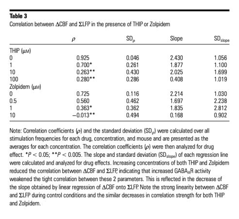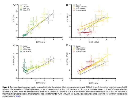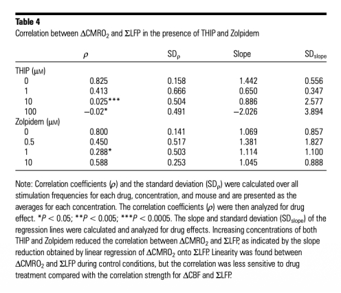 5 神經(jīng)血管耦合相關(guān)性數(shù)據(jù):ΔCBF和ΔCMRO2與總突觸活動(ΣLFP)在對照條件下線性相關(guān),但THIP和Zolpidem濃度增加削弱這種相關(guān)性。研究意義表明GABA能活動可解耦突觸活動與血流/代謝響應(yīng),影響B(tài)OLD信號解讀。數(shù)據(jù)來自Figure 3和Table 3、Table 4。