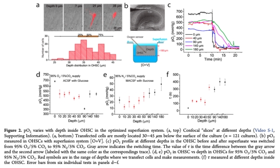 2. 測量了pO2隨OHSC深度的變化(圖2),研究意義是確定了轉染細胞所在深度范圍(30-45μm)的pO2可控且一致,為單神經元測量提供了可重復的環境。