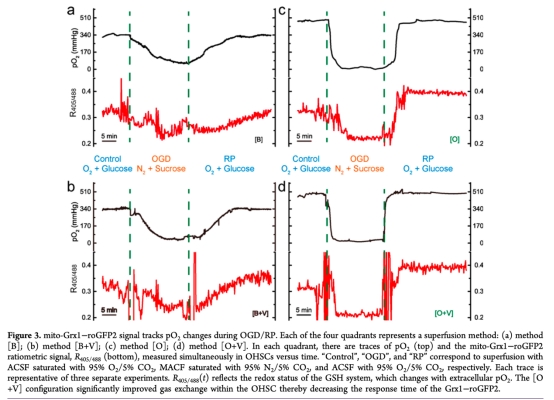 3. 測量了mito-Grx1-roGFP2信號與pO2變化的同步性(圖3),研究意義是證實了傳感器能快速響應OGD/RP過程中的氧化還原變化,驗證了方法的實時性。