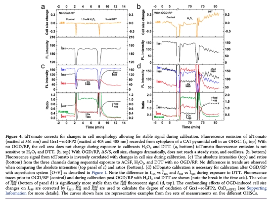 4. 測量了tdTomato作為內部標準校準Grx1-roGFP2的效果(圖4),研究意義是解決了OGD/RP后細胞形態變化對熒光信號的干擾,使氧化還原參數(如OxDroGFP2)的定量更準確。