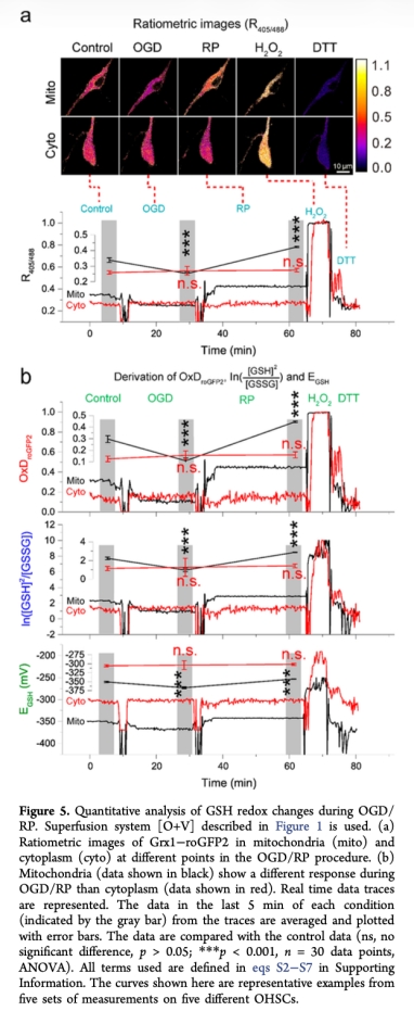 5. 測量了線粒體和細胞質中GSH氧化還原狀態在OGD/RP過程中的變化(圖5),研究意義是揭示了線粒體GSH系統在OGD期間更還原、RP期間更氧化的動態變化,而細胞質無顯著變化,表明線粒體對氧化應激更敏感,為理解腦卒中機制提供了新見解。