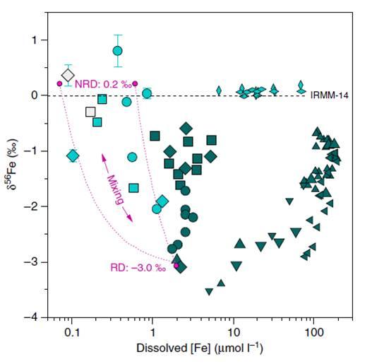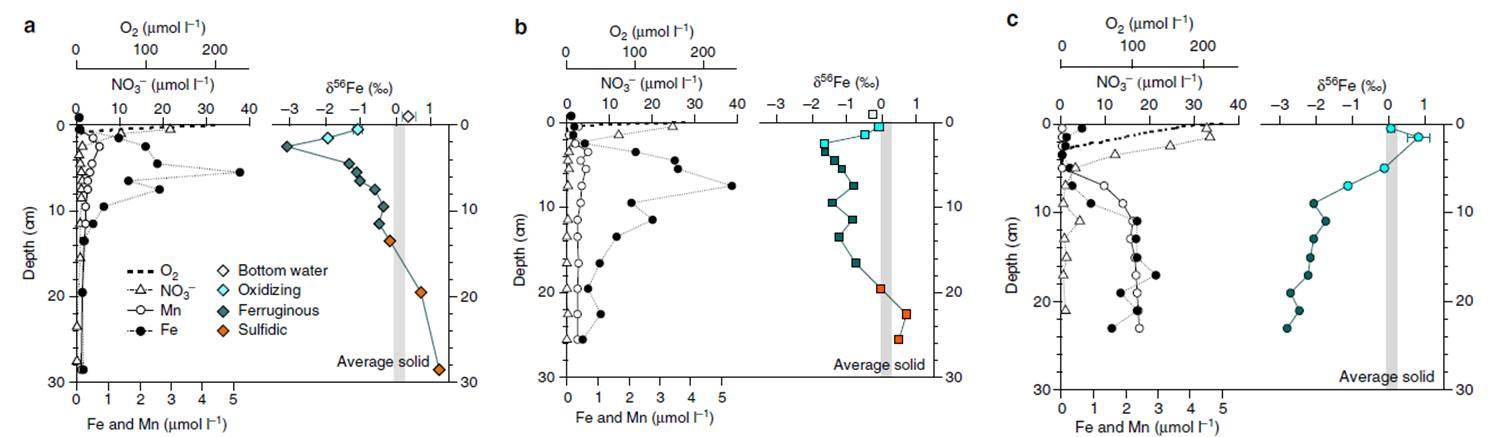 研究表明從南非的半干旱海洋邊緣被動構造中孔隙水的獲取的鐵同位素數據說明了與主動結構和無氧大陸邊緣區域中的溶解鐵相比,該區域中的溶解鐵的體積更小,同位素更重。這些數據提供了來自大陸邊緣存在的原位非還原性鐵溶解于的證據,并進一步表明地質和水文氣候因素可能影響進入海洋鐵的數量和鐵的同位素組成。