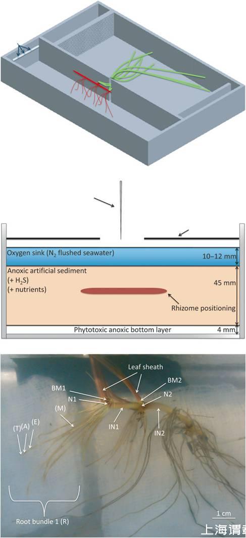 圖1、圖a表示的是模擬的分流實(shí)驗(yàn)箱設(shè)備圖,試驗(yàn)箱的另一端有流動(dòng)的水相以及缺氧的沉積物層。圖b表示的是應(yīng)用微電極測(cè)試人造模擬的具有三層結(jié)構(gòu)的沉積物底泥系統(tǒng)。圖b中可以看出模擬底泥系統(tǒng)中的最上層是一層含有10-12毫米厚的流動(dòng)水相,中間層是含有一定濃度硫化氫的無(wú)氧沉積物底泥最下層是植物性毒物底層(厚度為4mm),圖c表示的是大葉藻在地下的根際組織區(qū)域的空間分布示意圖。其中T代表的是根尖/根冠,A代表的是頂端分生組織區(qū)域,E代表的是根的伸長(zhǎng)區(qū)域,M代表的是根的生長(zhǎng)成熟區(qū)域,BM代表的是帶葉鞘的基底分生組織,N表示的是根的節(jié)點(diǎn),IN表示的是植物的節(jié)間區(qū)域。