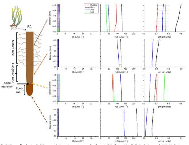 圖3、經(jīng)過(guò)顯微鏡放大的大葉藻根束不用區(qū)域的(成熟區(qū)、伸長(zhǎng)區(qū)域、根冠區(qū)域、根的頂端分身組織區(qū)域)氧氣濃度、pH、硫化氫濃度的分布情況。其中圖b中的四種不同顏色的線分布表示的是大葉藻所處的不同環(huán)境紅色線(低氧狀態(tài)下)、黑色線(無(wú)光照條件)、藍(lán)色線(使用了波長(zhǎng)為260nm的紫外光線光照)、綠色線(波長(zhǎng)為350n的紫外光線光照)。從圖中可以看出,在大葉藻根束區(qū)域的氧氣濃度幾乎為零,而硫化氫的濃度在50-100umol/L,而pH的分布情況則是6.3-6.9。
