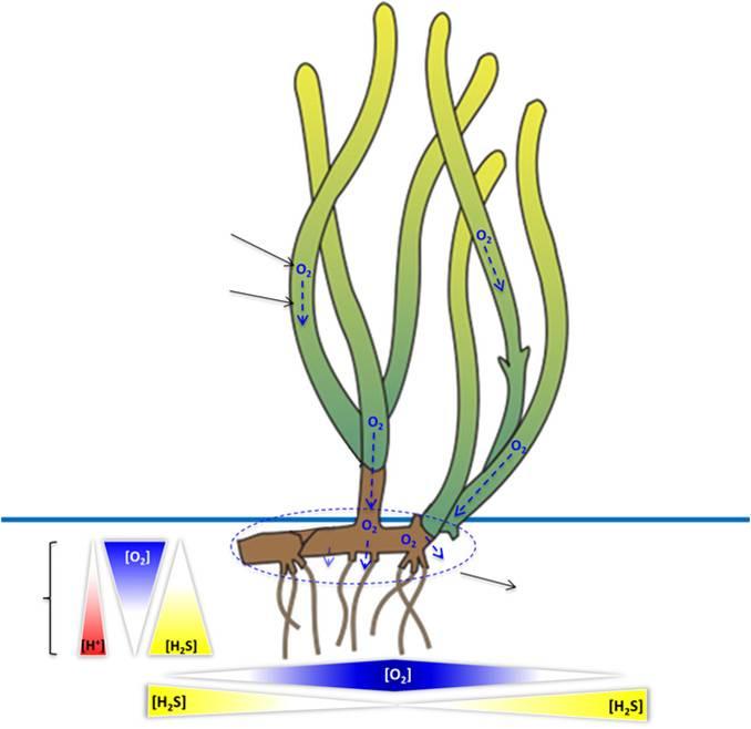 本論文研究了大葉藻根際周圍區(qū)域的環(huán)境變化對(duì)于大葉藻根系的生長(zhǎng)影響,研究發(fā)現(xiàn),大葉藻能夠利用其中的根際的葉鞘區(qū)域產(chǎn)生的高速率的產(chǎn)氧量來(lái)改變其自身生長(zhǎng)的微化學(xué)環(huán)境,這也確保了能夠產(chǎn)生植物性毒素的硫化氫能夠被氧化,形成化學(xué)防御機(jī)制,保護(hù)大葉藻脆弱的根部分身組織,另外植物自身的pH調(diào)節(jié)導(dǎo)致的pH值變大的過(guò)程通過(guò)將硫化物以及降低植物性毒素H2S轉(zhuǎn)換為無(wú)植物毒性的HS-離子。