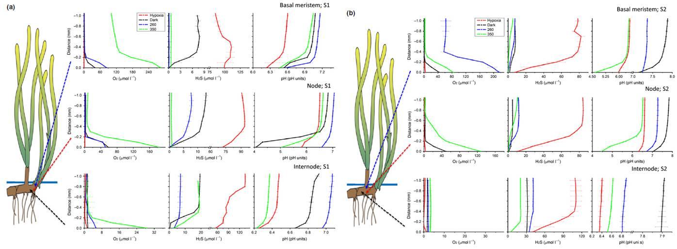 圖2、應(yīng)用Unisense微電極測(cè)試的大葉藻根際區(qū)域不同組織區(qū)域(葉鞘的基底分生組織區(qū)域、根的結(jié)點(diǎn)區(qū)域、根的間區(qū)域)的氧氣濃度、pH、硫化氫的剖面圖。其中t圖a和圖b分布表示的是所取的兩組不同根際區(qū)域。其中圖a,b中的四種不同顏色的線分布表示的是紅色線(低氧狀態(tài)下)、黑色線(無(wú)光照條件)、藍(lán)色線(使用了波長(zhǎng)為260nm的紫外光線光照)、綠色線(波長(zhǎng)為350n的紫外光線光照)。從圖中可以看出,在低氧狀態(tài)下的根據(jù)組織區(qū)域的各位區(qū)域中的氧氣濃度都很低,而在無(wú)光照條件、使用波長(zhǎng)為260n、350nm的紫外線的條件下,根際組織區(qū)域部分的氧氣濃度越靠近根際的表層,其氧氣濃度越大,而對(duì)于硫化氫來(lái)說(shuō),根據(jù)的表層的硫化氫濃度較低,根際底部區(qū)域的硫化氫濃度較大。而pH則是靠近根際表層區(qū)域的pHj較小,遠(yuǎn)離根際的底部的pH值較大。