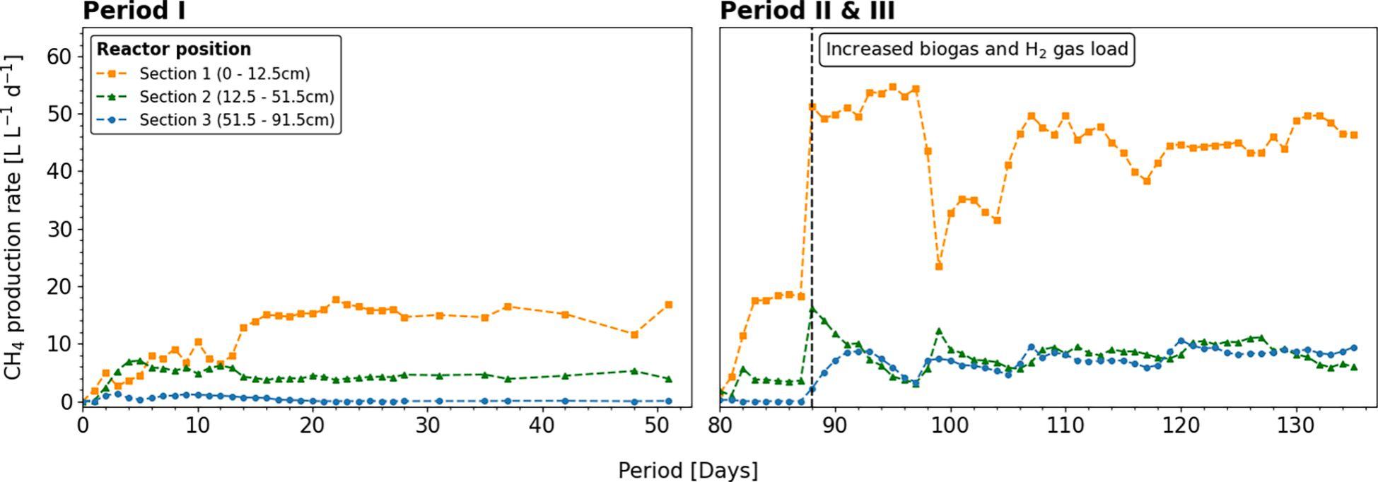 圖3、135天操作期間,在滴流床反應(yīng)器垂直軸線上不同位置的傳感器測量的局部甲烷生產(chǎn)能力時間序列數(shù)據(jù)(基于連續(xù)的氫氣傳感器和定期的氣體成分及流量測量):第1段(0–12.5厘米),第2段(12.5–51.5厘米),第3段(51.5–91.5厘米)。每個數(shù)據(jù)點代表1440次測量的平均值(每分鐘1次測量)。