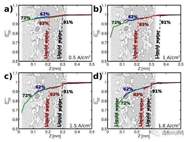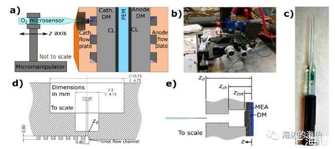 微電極的應用:研究中使用了尖端直徑為25微米氧氣微電極(unisense)原位的測試了燃料電池陰極區域中擴散層介質中的氧氣的濃度,通過獲得的氧氣濃度的剖面圖分析獲得了擴散層介質中氧氣的運輸情況,并相應的計算出氧氣的傳輸系數。