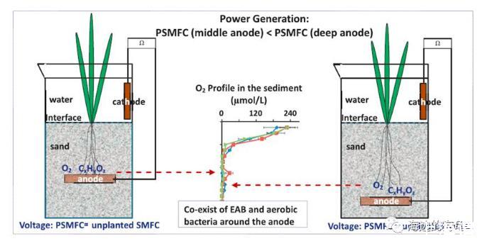微電極的應用介紹:采用氧氣微電極傳感器(unisense微電極分析系統)測定了PSMFCs體系砂中氧的濃度分布剖面。研究發現植物根系可以釋放氧氣,在沙中氧氣梯度的驅動下向上和向下輸送,形成根際微氧環境。對植物沉積物微生物燃料電池(DPSMFCs、M-PSMFCs,S-PSMFCs)的微剖面進行分析,從水沙界面處到沙土下-3.5cm或4.0cm處,氧的濃度明顯降低到接近于零,而沙土表面更深處(-5.0cm—7.0cm)能觀察到明顯的氧損失帶,距離沙土表面5cm處對應的氧的最大濃度為10.8umol/L。這些研究數據表明,當將陽極置于根的下方,并保持適當的距離,使PSMFCs能夠利用根源有機物,可以很好的避免氧損失的負面影響。此研究表明一定的氧損傷可以控制植物沉積物微生物燃料電池(PSMFC)發電的晝夜節律。