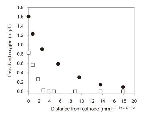 AC-MFC(空氣陰極微生物燃料電池)中離陰極區域不同距離處的原液中氧氣濃度(其中□表示的是陰極不含有生物膜帶,●表示陰極區域不含有帶醋酸鹽)