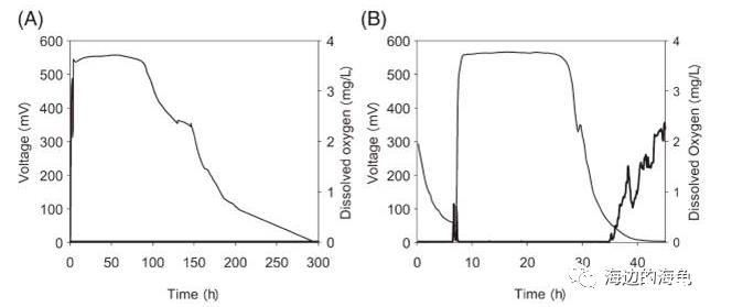 微電極測試AC-MFC(空氣陰極微生物燃料電池)間歇循環中生物膜內的溶氧濃度,研究生物膜的存在對電壓(細線)和陽極附近的溶氧(粗線)的影響
