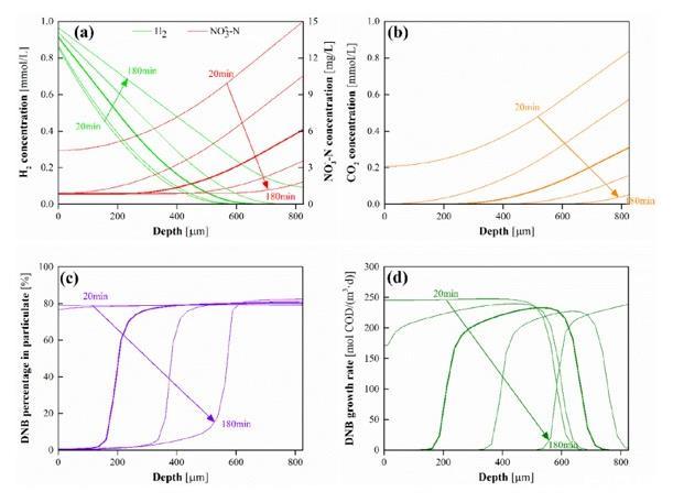 圖2、(a)電子供體(H 2)和受體(NO 3-)分布、(b)CO 2分布、(c)DNB在顆粒成分中的分數和(d)DNB沿深度方向的生長速率的模型評估系統的生物膜作為HRT的函數,范圍從20到180分鐘(場景E2)。模擬條件:生物膜厚度=825μm,本體液體pH=7.5,H 2壓力=5 psig,CO 2添加量=50 mg/L,進水NO 3-和SO4 2-濃度分別為20 mg N/L和20 mg分別為S/L。X軸的零點為膜側,深度為離膜側的距離。