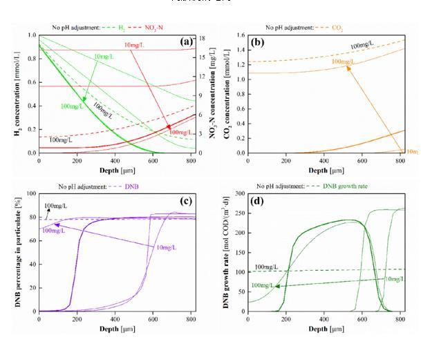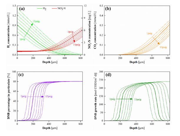圖3、(a)電子供體(H 2)和受體(NO 3-)分布、(b)CO 2分布、(c)DNB在顆粒成分中的分數和(d)DNB沿深度方向的生長速率的模型評估系統的生物膜作為H 2壓力的函數,范圍為1至15 psig(方案E3)。模擬條件:生物膜厚度=825μm,本體液體pH=7.5,HRT=80 min,CO 2添加量=50 mg/L,進水NO 3-和SO 4 2-濃度分別為20 mg N/L和20 mg S/L。X軸的零點為膜側,深度為離膜側的距離。