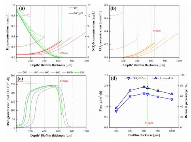 圖5、(a)H 2和NO 3-和(b)CO 2曲線的模型評估,(c)DNB沿生物膜深度的生長速率,以及(d)NO3-系統的去除通量作為生物膜的函數厚度范圍從200到1000μm。模擬條件:本體液體pH=7.5,H 2壓力=5 psig,HRT=80 min,CO 2添加量=50 mg/L,進水NO 3-和SO 4 2-濃度分別為20 mg N/L和20 mg S/L。X軸的零點為膜側,深度為離膜側的距離。圖9d比較了不同生物膜厚度下的NO3-去除通量,結果顯示生物膜厚度為600μm時的反硝化率最高。