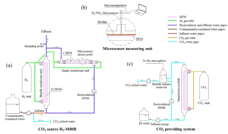 圖1、CO 2源H2-MBfR設置的示意圖。該系統由三部分組成:(a)H 2-MBfR:綠線表示H2氣管,而藍色、紅色和深紅色線是水管。(b)組裝在帶有內置單HFM的水平玻璃流通池端口上的微傳感器測量單元的細節。(c)CO2供給系統:青色線代表富含CO2的水,棕色線代表CO 2氣管。
