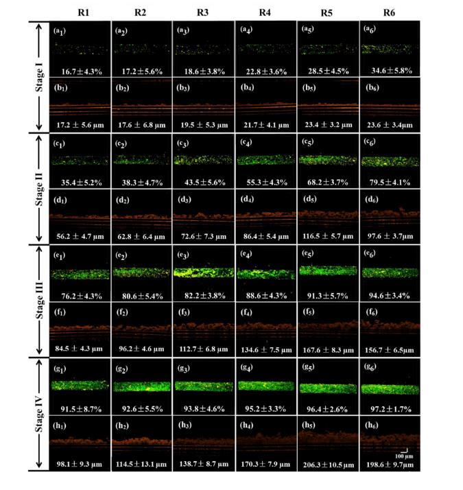 圖1、通過結合OCT和CLSM觀察,在不同氧分壓下生物膜時間發展的顯微可視化。(a)、(c)、(e)和(g)分別基于堆疊CLSM圖像的階段I至IV的微生物覆蓋因子;(B)、(d)、(f)和(h)相應階段的生物膜厚度,基于原地OCT觀察。