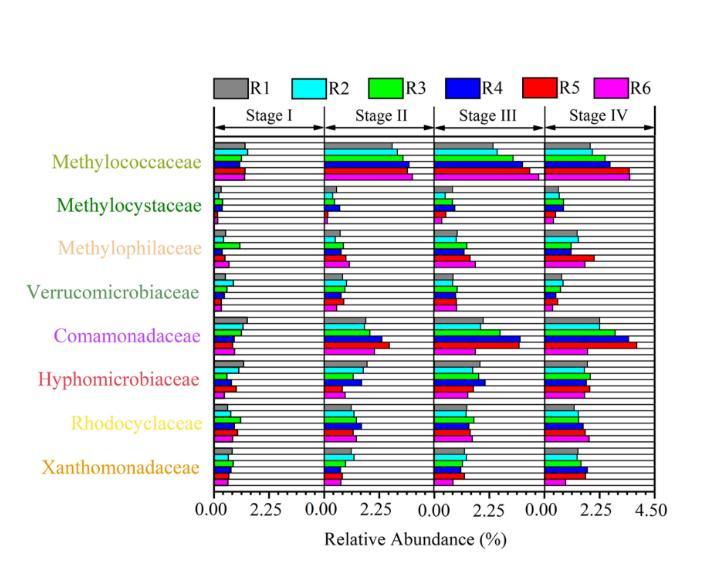 圖2、不同氧分壓下生物膜微生物組成的變化:基于16s rRNA基因高通量測序的關鍵微生物群落在科水平上的相對豐度。