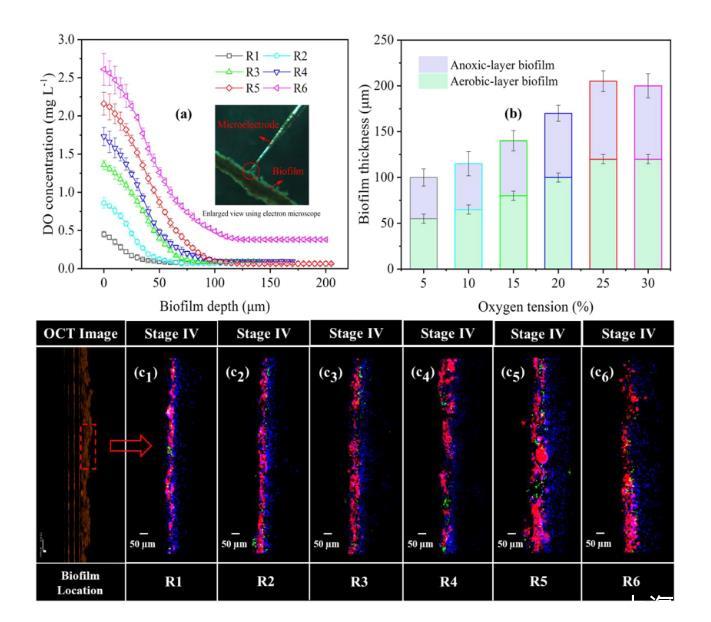 研究簡介:在膜生物膜生物反應器(MBfRs)中進行的好氧甲烷氧化-反硝化(AME-D)為同時減少甲烷(CH4)排放和去除廢水中的硝酸鹽提供了良好的前景。然而關于氧分壓如何影響反擴散生物膜的發育和特性、其空間分層特征以及生物膜微生物之間的協同作用等方面的系統實驗研究尚缺乏。在本研究中,研究人員首次將光學相干層析成像(OCT)與共聚焦激光掃描顯微鏡(CLSM)相結合,原位表征了MBfR中反擴散生物膜的發展。結果表明,MBfR上的氧分壓能夠控制生物膜的厚度和空間分層,進而控制功能微生物的分布。在優化的氧氣分壓5.5 psig(含氧量25%)條件下,AME-D工藝反擴散生物膜的反硝化效率最高,主要原因是該生物膜在好氧層和缺氧層之間具有良好的動態平衡,好氧層中有合適的氧氣梯度和足夠的好氧甲烷養菌,有利于甲烷氧化。