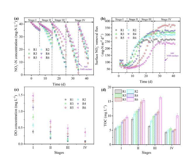 圖4、在MBfRs運行期間在不同氧分壓下的反硝化性能。(a)-MBfR出水中NO3?-N的濃度;(B)表面NO3?-的變化根據方程式S1計算的氮去除通量;(c)在每個階段結束時MBfR中的DO濃度;(d)每一階段結束時所有MBfR的TOC濃度。