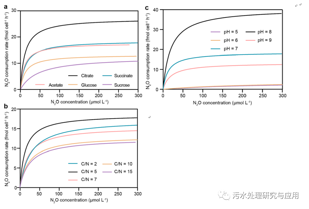 圖1、采用Michaelis-Menten模型分析了(a)碳源、(b)C/N和(C)pH對N2O去除動力學(xué)的影響。