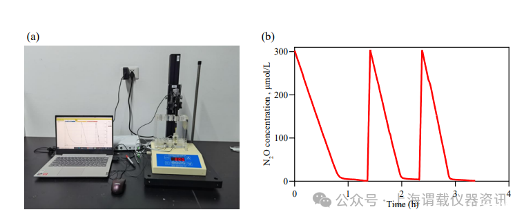 圖2、(a)unisense實時檢測N2O濃度的微呼吸系統(tǒng)和(b)原始N2O去除剖面示例。
