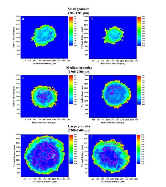 圖2、污水處理反應(yīng)器運行30天后,有碳源(a、c和e)和無碳源(b、d和f)的R3顆粒內(nèi)部的DO分布和缺氧區(qū)。*紅區(qū)為高DO區(qū),藍區(qū)為低DO區(qū),缺氧區(qū)(DO〈0.3mg·L-1)為低DO區(qū)?1)被粉紅色曲線包圍。結(jié)果表明,由于顆粒污泥內(nèi)部孔道和孔隙結(jié)構(gòu)的影響,DO在顆粒污泥中呈明顯的非各向同性分布。