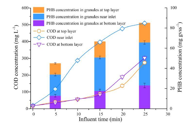 圖5、進水期間(第60天)R3污泥層中COD和PHB的動力學(xué)。進水期間,進水附近COD濃度迅速上升,而遠離進水處的COD濃度由于擴散阻力的影響略有上升。